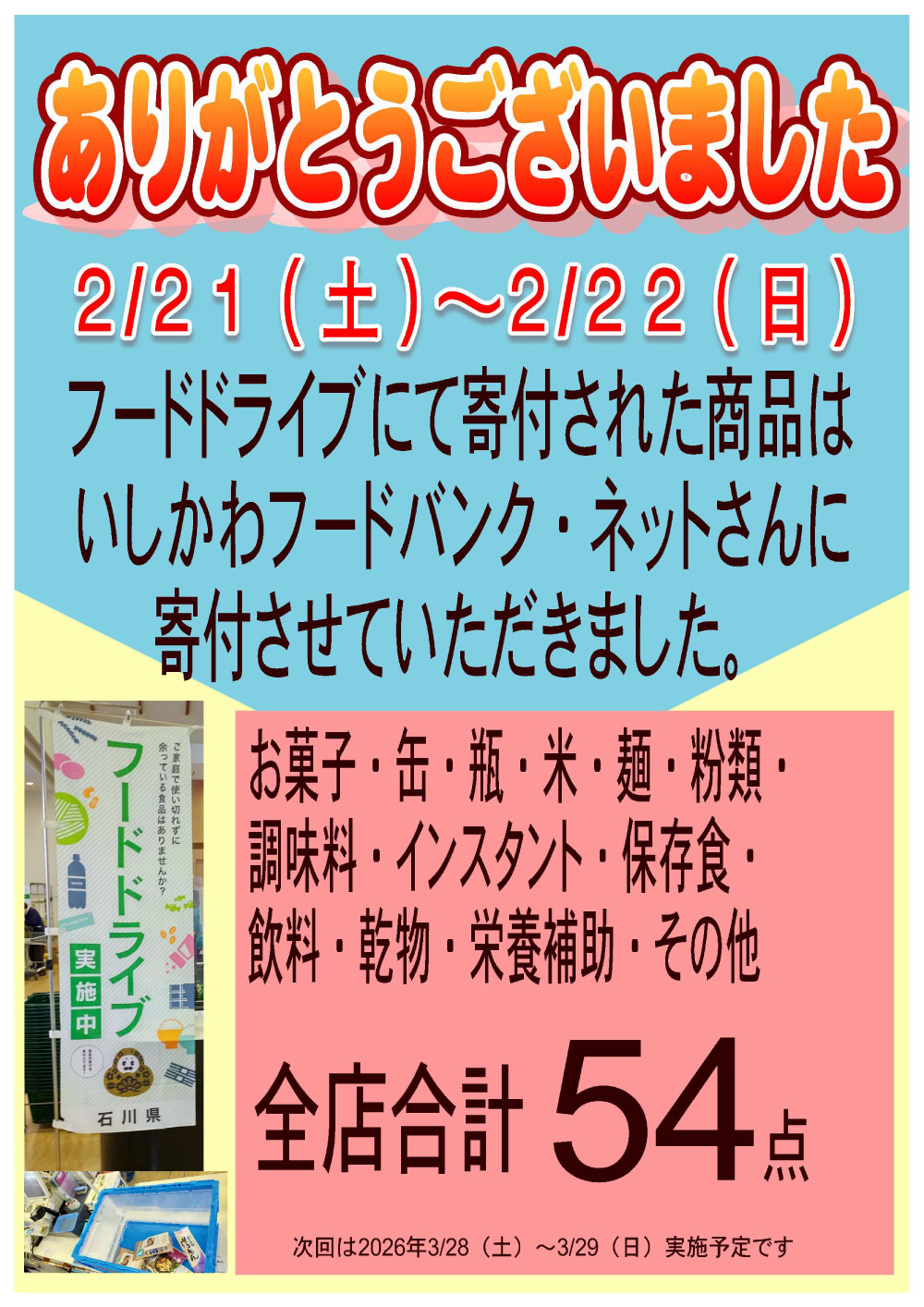 2/21(土)~2/22(日)フードドライブ実施に伴い たくさんの寄付を頂き、誠にありがとうございました。