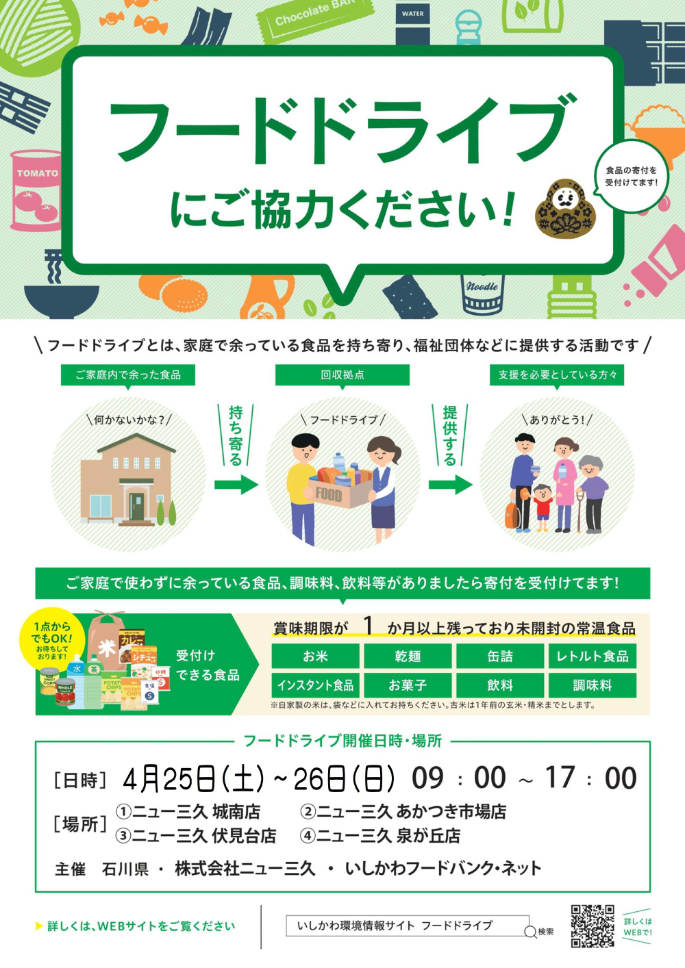 ニュー三久全店にてフードドライブを実施致します。